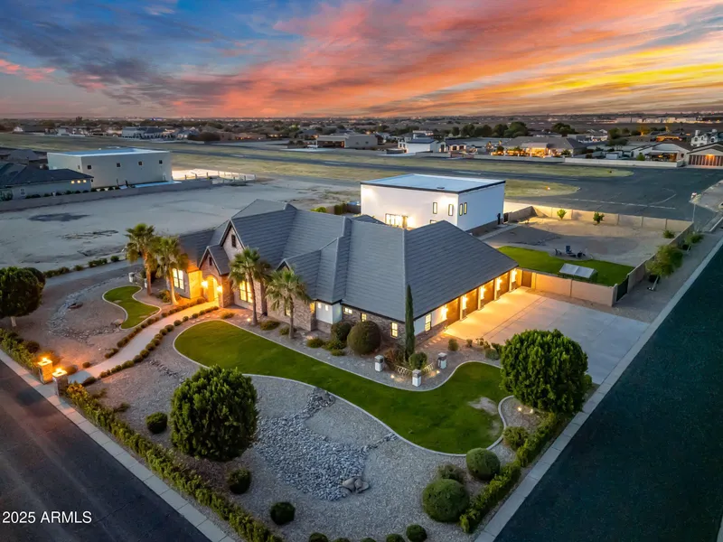 Experience the rare opportunity to own a runway-accessible luxury home in Pegasus Airpark, perfectly designed for the aviation enthusiast who wants space, privacy, and a hangar that supports a true flying lifestyle. This 5-bedroom, 5.5-bath, 4,462 sq ft home sits on a premium corner lot with San Tan and Superstition Mountain views, offering the ideal blend of craftsmanship, function, and flight-ready convenience. Direct taxiway access to the private runway, a 50x60 hangar with a 54x16 LiftMaster radio-controlled door, full kitchenette, and full bathroom make this property incredibly rare for pilots searching for homes with private runway access or families needing a massive, versatile toy-storage space. Inside, the home features coffered ceilings, true artisan craftsmanship, and a layout that lives like a single level, with only the media room and bonus room upstairs for optimal privacy ...