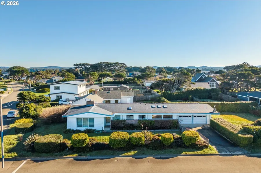 OCEAN WAVES ROLLING ON IN to the Jetty at the mouth of the Coquille River is the view from this single level 1960 Ranch Home on large, fenced lot features 3 Bedroom/2 Baths, 1962 sq. ft., decorative brick siding, picture windows, a spacious family room with 6 skylights in addition to the large Living Room/Dining Room with Pellet Stove with Brick & Myrtlewood Mantle, new Daikin Heat Pump, front loading Kenmore Elite Washer/Dryer, vinyl windows, small sheltered, private deck, 2 car attached garage with built in workbench & shelving plus an extra fridge. Sold mostly furnished if you would like. The .22-acre yard is fenced into 3 sections. One area, 55 x 60 ft. might be just right for an ADU, studio or shop or just an enviable garden. Quick walk to all the fun: beach, park, library, pickleball, disc golf, senior center, Old Town shops & dining! Great Bandon Beach House in a prime sweet spot!