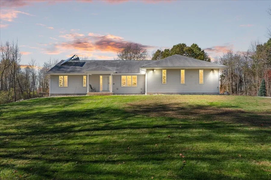 This beautiful, custom-built executive ranch sits atop nine secluded, densely wooded acres, offering exceptional privacy and natural beauty. The home features a spacious main-floor primary suite with an en-suite bath, large walk-in closets, a marble shower, and a relaxing whirlpool tub. An open floor plan with cathedral ceilings enhances the sense of space, while EnergyStar efficiency ensures comfort and performance throughout. The fully finished walkout lower level provides additional living space with a cozy rec room and fireplace, two generous bedrooms, and a full bath-perfect for guests or family. A true highlight of this property is the impressive nearly 4,000 sq. ft. pole barn. Designed for versatility, it includes two separate heated spaces, two 14' access doors on one side, and a 2.5-car access door on the other. The building is also plumbed for a full bath and offers the potenti...