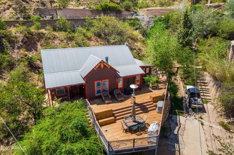 Perched up off of High Rd in Old Bisbee, This 2 bed 1 bath Miners Cabin is lovingly referred to as The Eagles Nest. With views into Mexico, the home has Redwood siding, enormous deck, fully fenced yard, carport, Ben Franklin gas stove, hardwood floors, granite counter-top, lush mature Tombstone Rose and shade trees to enjoy Bisbee's perfect year-round weather. Raised garden beds on the side deck produce everything needed for the salsa! This property has been thoughtfully updated with modern finishes yet retains that perfect blend of Bisbee's historic past. Walk to the town center in 3 minutes. The library, coffee shops, restaurants, post office, bars, live music and more are all in close proximity. There is room for e-bikes and golf cart. The best of the Bisbee lifestyle awaits!