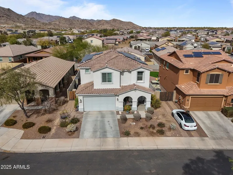 Stunning home in one of the fastest-growing cities in the country! This 3-bed, 2.5-bath residence with a versatile den and spacious loft sits in the desirable Sienna Hills community-soon to be walking distance to the 50-acre Verrado Marketside Mall set to open 2026. The chef's kitchen impresses with stainless steel appliances, double ovens, 5-burner gas cooktop, modern wood-slab island, granite counters, and a walk-in pantry. Flexible spaces include a large loft, private den, and a 3-car tandem garage. Step outside to a beautifully landscaped backyard with covered patio, pavers, and mature greenery-all framing breathtaking mountain views and unforgettable Arizona sunsets.
