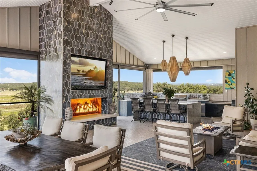 Situated on two acres with 296 feet of Canyon Lake frontage, this rare gem blends luxury living with vibrant lakeside energy. This reimagined mid-century modern home is a masterclass in design and craftsmanship, curated with dramatic architectural features and high-end finishes throughout. Cinematic lake and hill country views greet you through the custom wrought iron pivot door and continue throughout the home. Soaring cathedral ceilings, hammered porcelain floors, and expansive windows create a seamless indoor-outdoor experience. The chef-inspired kitchen stuns with Thermador appliances, a large pantry, and a dramatic 9' x 5.5' Cambria quartz waterfall island. It opens to a spacious living room anchored by a bold chiseled granite fireplace. Step outside to a covered patio and veranda with an outdoor kitchen, perfect for al fresco dining. Enjoy the tiled pool with sweeping lake views or head down to your private shoreline for boating, fishing, or relaxing. A custom pool bathroom adds convenience after lake days. The owner's wing offers serene lake views, private patio access, and spacious walk-in closets. The newly designed en-suite bath is a spa-like retreat with a soaking tub and walk-in shower that overlooks the lake. An attached 4-car garage and 2,000 sq. ft. workshop with three bays provide ample room for auto collections, watercraft, or UTVs. Ask your agent for the full brochure and photo gallery. And on a personal note... As a close friend of the owners, I've had the joy of watching this remarkable transformation unfold. This home has been the heart of countless gatherings full of laughter and love. It's not just a house-it's a vibe, a feeling, and a place where memories are made. You won't just want to be here-you'll feel like you already belong.
