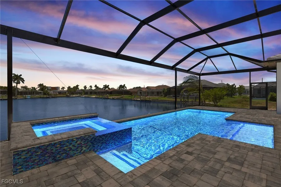 Experience the perfect fusion of LUXURY, comfort, and modern coastal living in this exceptional 3-bedroom + den, 3-bathroom, 3-car garage - WATERFRONT home. Offering 2,200 sq. ft. of refined living space, this newly COMPLETED masterpiece is ideally located just off Surfside Blvd in one of Cape Coral's sought-after neighborhoods. With Gulf access on a remarkable 350-ft-wide canal, this residence delivers the waterfront lifestyle so many dream of-but few attain. Step inside and feel the difference immediately. Soaring ceilings, designer finishes, and a light, open layout create a sense of elegance that flows room to room. The gourmet kitchen is a true showcase, highlighted by a quartz waterfall island with bar seating, premium appliances, a sleek backsplash, and a custom coffee area crafted for everyday enjoyment and entertaining. The living area centers around a custom-built media wall featuring an 85" TV and electric fireplace, along with 12 ft coffered ceilings, blending comfort and sophistication with effortless style. The owner's suite is your personal sanctuary, offering private lanai access, dual oversized walk-in closets, floating vanities, a freestanding soaking tub with a stunning accent backsplash, and an exquisitely designed walk-in shower. Step outside and embrace true Florida outdoor living. A beautifully designed heated pool and spa, outdoor grill station, a seating area with a large mounted TV, and expansive covered lanai create the ideal setting for hosting gatherings, savoring waterfront sunsets, or simply relaxing in your private oasis year-round. The home's curb appeal is equally impressive, with a semi-circular paver driveway, lush tropical landscaping, and a modern tile roof that combines durability with refined architectural charm. Fully completed and ready for its very first owner, this home also comes with ALL assessments paid-offering complete peace of mind. If you're seeking a luxury waterfront lifestyle without compromise, this property delivers on every level. Your slice of Cape Coral paradise awaits-schedule your private tour today.