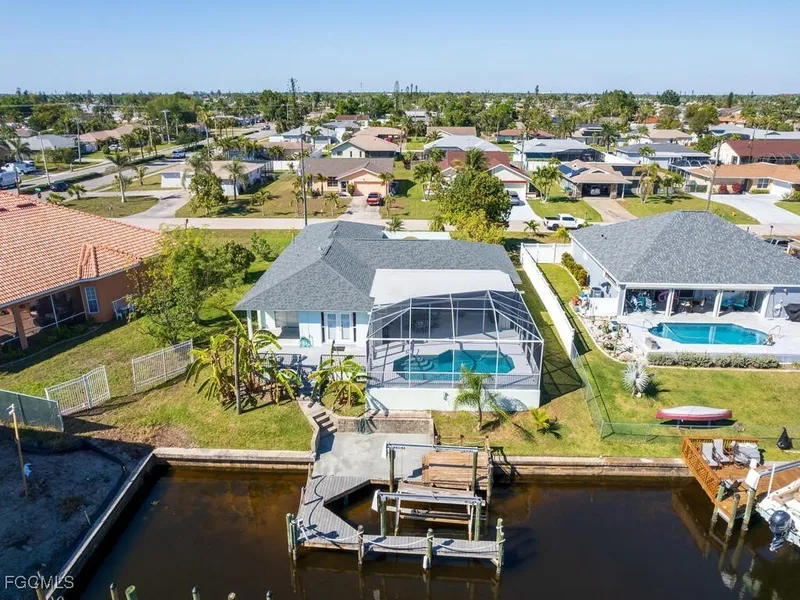 Beautifully updated waterfront and gulf access home that's NOT IN FLOOD ZONE! Single family pool home w/ new Roof in 2021, new hot water heater in 2025, new A/C unit & condenser in 2023, new pool heater in 2022, 30' of new seawall in 2018, new pool cage, new garage epoxy flooring, whole house has been painted inside/out plus lanai has been painted. Situated in the highly desired SE corridor of Cape Coral w/ Gulf access & Southern exposure. The inside of the home features a comfortable floor plan w/ split bedroom design, new floors and baseboards, new blinds, updated master shower, countertops have been redone, open concept kitchen, lots of natural lighting, laminate & tile flooring, and great room layout. You will love soaking up the sun on the massive rear screened lanai w/ heated pool, covered area that is ideal for outdoor dining, and a spacious sun deck. This is a boat lover's dream home w/ a private 7,000 lb boat lift, Captain's Walk, and in 2 miles or less than 25 minutes you will be in the open waterways. All Furnishings are negotiable. Located in and area of Cape Coral that has City Water/Sewer, plus this home has ALL assessments paid! The home is surrounded by well-maintained beautiful lush tropical landscaping, mango, orange, banana, coconut, lime, and avocado trees. Easy access to the Midpoint & S bridges of Cape Coral, close to shopping centers, hospital, library, and public parks including Four Mile Ecological Preserve. Perfect for investment property w/ annual or seasonal rental, in addition to having the potential of being a vacation rental.