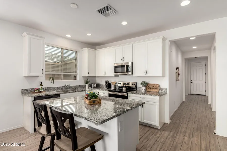 Don't miss your opportunity to own this stunning 4-bedroom, 2-bathroom home that perfectly blends style, comfort, and functionality. From the moment you walk through the front door, you'll be welcomed into a spacious open floor plan designed to accommodate both relaxed daily living and memorable gatherings with friends and family. At the heart of the home sits a show-stopping kitchen, where crisp white cabinetry and a gleaming granite countertops create a clean and modern aesthetic. A large center island offers ample prep space and seating-ideal for quick breakfasts or catching up over coffee. Stainless steel appliances and abundant storage make this kitchen as practical as it is beautiful. The kitchen flows effortlessly into the expansive great room, where the glass slider opens to reveal the backyard, inviting in a flood of natural light and creating a seamless indoor-outdoor living experience. The backyard is a true extension of the home, generously sized and thoughtfully landscaped with low-maintenance greenery and open space ready for your personal touch. Whether you're envisioning a future pool, play area, or a cozy firepit lounge, there's plenty of room to make it your own. Inside, every detail has been carefully considered to maximize comfort and convenience. The home features tons of built-in cabinetry and storage throughout, along with a spacious 3-car garage that provides plenty of room for vehicles, tools, and toys alike. Neutral-toned plank flooring, high ceilings, and large windows add to the home's light, airy ambiance. The primary suite is a true retreat tucked away from the secondary bedrooms for added privacy. You'll love the spa-like bathroom with a walk-in shower, dual granite-topped vanities, and an oversized walk-in closet with space to spare. Each additional bedroom is nicely sized can easily function as guest space, a home office, or a playroom to suit your lifestyle. Whether you're hosting a lively gathering or enjoying a peaceful night in, this home offers the perfect setting. With its modern finishes, open design, and exceptional use of space, it's more than just a home, it's a place to live, grow, and thrive.