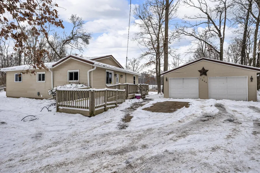 Ranch home Situated on a Beautiful wooded 1-acre lot, this Pristine location. Wonderful one level living. Three bedrooms, Two baths with a spacious kitchen, dining area and great cupboard space! Large living room, French doors leading to the deck overlooking the beautiful backyard. Primary bedroom suite, 2nd bath, laundry with 2 additional bedrooms. Updated vinyl flooring in the living room, bedrooms and baths. The large deck overlooks a small pond and abundance of wildlife. Plus, an oversized 2.5 car garage w/room for workshop. Close proximity to many lakes, golf courses, restaurants and US127.