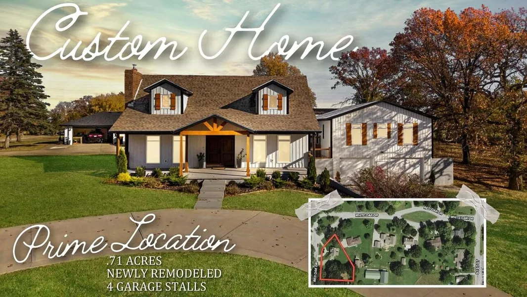 Don't miss this beautifully remodeled 2,885 sq. ft. custom home offering modern style, spacious living, and a prime location across from the golf course and close to local amenities. The exterior features rustic stained wood beams, clean modern lines, and solar-lit landscaping. Inside, new vinyl laminate flooring runs throughout the main level for a fresh, cohesive look. The stunning kitchen includes a large granite island, quartz countertops, custom soft-close cabinetry, and brand-new LG Energy Star appliances. An oversized sink and stone accent wall add character, while the open layout connects the kitchen, dining area, and living room for easy entertaining. The main-floor master suite features his-and-hers closets, double sinks, and a custom tile walk-in shower. A half bath, laundry room, and a convenient hall closet with built-in charging stations complete this level. Upstairs are two spacious bedrooms with sitting areas and a full bath. The partially finished basement offers a second living area with a wood-burning fireplace insert, storm shelter, storage space, and a two-car garage. A major bonus is the 30x40 detached garage/shop, with space for up to four vehicles on the lower level and a 1,200 sq. ft. open upper level perfect for an office, studio apartment, game room, or in-law suite. This home is exceptionally energy efficient thanks to a new HVAC system, 19 SEER heat pump, LED lighting, digital Bluetooth thermostats, and double-pane tinted windows. Combined electric, water, sewer, and trash bills average just $100 per month, making this home incredibly economical. Sitting on nearly an acre with mature oak trees, the property offers natural shade, a peaceful setting, and ample parking for a boat or RV. With easy access to Nevada, Stockton Lake, Truman Lake, and Pomme de Terre, and just over an hour to Springfield or Kansas City, this home delivers comfort, efficiency, and convenience in one impressive package.