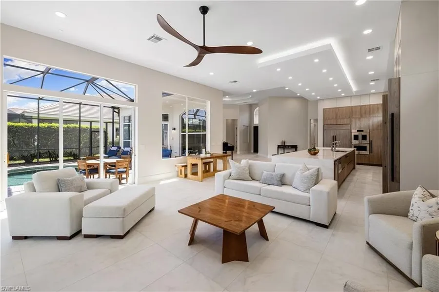 This fully renovated custom residence presents a rare combination of timeless design, modern technology, and a strategic layout where each space has been optimized for flow, function, and everyday ease of use. From the moment you enter, you are greeted by a light-filled open concept floor plan that is perfect for entertaining friends and loved ones. Italian porcelain tile, solid wood doors, LED lighting with Lutron Caseta smart switches, and a stunning selection of high-end finishes set the tone for a home that blends elegance with efficiency. At the heart of the home, the natural gas chef's kitchen showcases a floor to ceiling design with a five-foot Galley workstation and dual Brizo SmartTouch faucets with instant hot and filtered water dispensers. Monogram appliances throughout include a 48-inch professional series gas cooktop with six burners, griddle and wall mounted pot filler, double French door convection ovens, a 48-inch paneled refrigerator, wine cooler, and drawer microwave. A Bosch SuperSilence dishwasher, Blum hardware, Silestone Calacatta Gold quartz, and a striking waterfall island elevate the space, while a beverage station with Kraus sink and Brizo Kitchen Bar faucet and a built-in pet feeding station with Brizo wall mounted pot filler make this the ultimate dream kitchen for your and your fur family. The spacious owner's suite is a private retreat with dual custom closets, Caesarstone mitered edge countertops, Sietto cabinet hardware, a waterfall shower with niche, LED lit mirrors, storage pull outs with hidden outlets, and a soaking tub. The two guest ensuite bedrooms, including a flex room with Murphy beds, are finished with floating vanities, quartz and quartzite counters, custom lighting, and new cabinets and tile. The laundry and office have also been enhanced with quartz counters, under cabinet LED lighting, engineered hardwood flooring, and plantation shutters. Outdoor living includes an extended lanai with summer kitchen, natural gas TEC infrared grill, outdoor shower, and a saltwater pool with Hayward Aqualogic automation, and a spa-inspired pool bath. The three car garage features epoxy floors, Premier cabinetry, and overhead storage. Enjoy peace of mind with a discounted TRANSFERABLE FLOOD POLICY, brand-new tile roof installed in 2024, thirty-five solar panels with Enphase microinverters, a Navien tankless natural gas water heater, new IPEX plumbing and CAT 6 wiring, and a private irrigation well for landscaping. West Bay Club provides an amenity rich lifestyle for all residents including a newly built Gulf front Beach Club with restaurant and towel service, the renovated Bay House with resort style pool and state of the art fitness center, a River Park with boat launch, fishing pier and kayaks, six pickleball courts, eight Har-Tru tennis courts, bocce, two dog parks, and optional membership in a private Troon(R) managed championship 18 hole Pete Dye golf course.