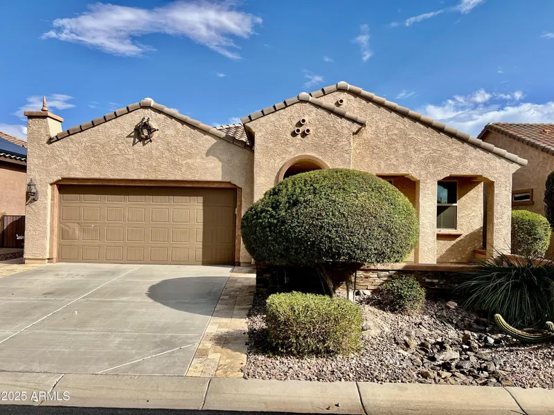 **Great Floor Plan with Ultimate Privacy** Popular Hideaway floor plan on an upgraded lot with no neighbors behind! Morning sunrises in the very private backyard and beautiful sunsets on the custom Travertine Tile front courtyard. Large GRANITE island in the kitchen... perfect for a breakfast bar or your neighborhood parties. This home has been very nicely upgraded with Travertine Tile, Custom Security Door(s), upgraded cabinets with pull out drawers, pendant lighting, fans, GAS stove/oven, custom designed entertainment wall, large laundry with cabinets and sink, flex space in the laundry for storage or craft space, large master bathroom with walk-in shower, extended master bedroom, door from master bedroom to covered patio, privacy wall in backyard patio area and open space natual... views in the backyard. Fully fenced backyard for the dogs or more security. 2nd bedroom has a Murphy Bed...