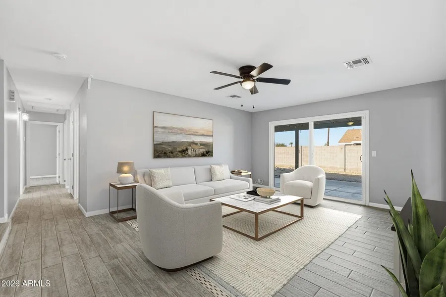 NEWLY CONSTRUTED in 2022, this energy-efficient, single-level home with no HOA and OWNED SOLAR w/ no lease or loan, features an open-concept great room with wood-look tile throughout the main living areas. The kitchen includes, a peninsula breakfast bar with seating, modern shaker cabinetry, stainless appliances, pantry storage, and an eat-in dining area. The primary bedroom includes an en-suite updated bath. An interior laundry room includes washer and dryer. Additional features include dual-pane Low-E vinyl windows, ENERGY STAR-qualified equipment, programmable thermostat, ceiling fans, and an owned solar system worth over $38,000, The backyard offers a covered patio, additional patio space, desert landscaping, rain gutters, and an attached 2-car garage. Located on a north/south exposure lot in an established non-HOA community, this home offers convenient access to shopping, dining, parks, and schools, with easy connections to major roadways for commuting across the Valley. Enjoy the flexibility and freedom of no HOA restrictions in a well-situated neighborhood. A rare opportunity to own a nearly new, move-in-ready home in a prime Glendale location.