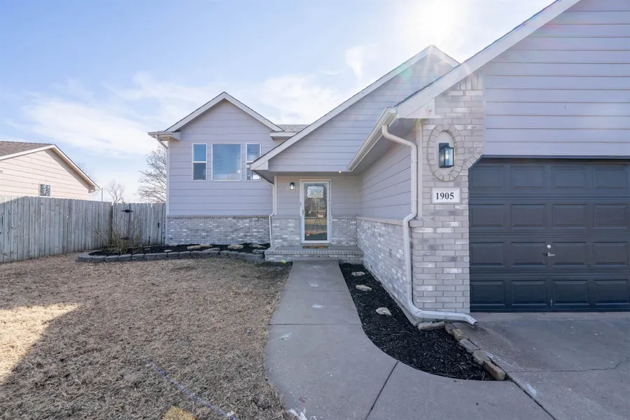 Welcome home to this beautifully updated 4-bedroom, 3-bathroom home tucked away in a quiet cul-de-sac in Goddard! With stylish updates throughout and a functional layout designed for both everyday living and entertaining, this home truly checks all the boxes. Step inside to find fresh paint, brand-new flooring, and updated lighting throughout, creating a bright, clean, modern feel. The updated kitchen shines with new quartz countertops, freshly painted cabinets, a new backsplash, and refreshed lighting-offering both beauty and functionality for cooking and gathering. The spacious master suite provides a relaxing retreat, complete with a large walk-in closet and a private en-suite bathroom featuring a luxurious jacuzzi tub. The walkout basement adds even more living and entertaining space, highlighted by a sleek wet bar with floating cabinets-perfect for hosting friends and family. Outside, enjoy the fully fenced backyard with a privacy fence and storage shed, offering space for pets, play, or outdoor relaxation. The 2-car garage includes built-in storage cabinets and a workbench, adding extra convenience and organization. Located in a peaceful cul-de-sac setting, this move-in ready home offers the perfect combination of updates, space, and privacy. Don't miss your opportunity to make it yours!