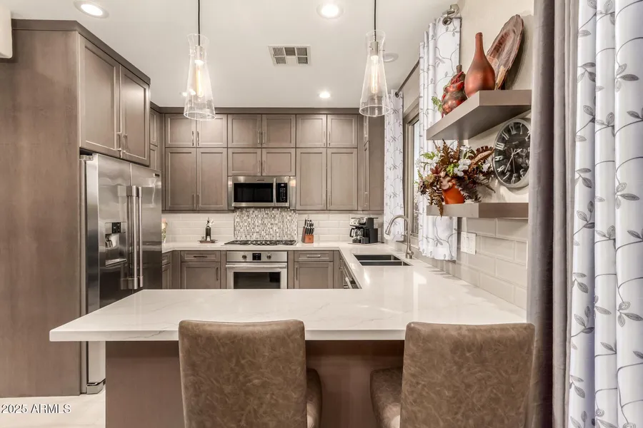 Gorgeous single level home in Estrella completely remodeled inside and out by original owners! Designer remodel includes spectacular chef's kitchen with double stacked custom cabinetry, quartz countertops, tiled backsplash and all appliances including gas cooktop, wall oven and refrigerator. Wood tile flooring everywhere except two bedrooms. Upgraded bathrooms w/custom tiled showers. Extremely energy efficient with newer windows, HVAC and fully owned solar - including a newer roof! Enjoy a thoughtfully designed low-maintenance backyard with covered/screened-in patio, pergola & storage shed. The community elevates everyday living w/two clubhouses, heated pool, hiking trails, playgrounds, gyms, golf course, tennis courts, pickleball and a scenic lake. You won't find another one like this