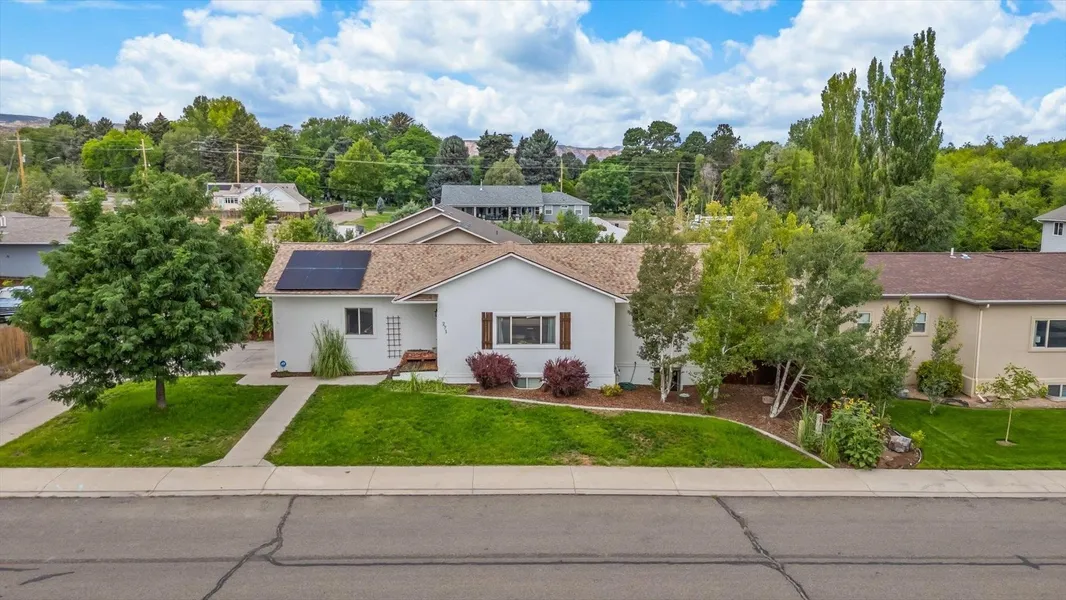 Tucked away in a charming cul-de-sac just two miles from Main Street and the heart of downtown Grand Junction, this vibrant and beautifully maintained ranch-style home with a fully finished basement is truly a standout! From the moment you walk in, you're greeted by a light, bright, and cheerful atmosphere complemented by upgraded luxury vinyl plank flooring throughout the main level, offering both style and durability. The spacious main-level primary suite serves as a serene retreat, complete with a spa-like en suite featuring dual vanities, a luxurious soaker tub, a walk-in shower, and an oversized walk-in closet. The chef's kitchen is a dream come true, boasting gleaming vinyl wrapped countertops that give a granite aesthetic, wraparound bar seating, stainless steel appliances including a double oven and electric cooktop with range hood, eye-catching backsplash, and rows of upgraded two-tone cabinetry. A cozy and convenient dining area sits just off the kitchen, perfect for everyday meals or entertaining guests. Downstairs, enjoy two additional generously sized bedrooms, a full bathroom, and a large family room ideal for movie nights, play space, or a second living area. Laundry is conveniently located on the lower level as well. The outdoor space is equally impressive, with a meticulously manicured backyard that includes a spacious open deck, low-maintenance rock patio, and thoughtfully designed garden beds ready for any green thumb. The home is equipped with a whole-house water filtration system and owned solar panels, providing not only energy efficiency but real, transferable savings without a lease or purchase agreement (Buyer must qualify for payment installment transfer through Solar Company). With 3 bedrooms, 2.5 bathrooms, two large living spaces, central A/C, and an attached two-car garage, this home perfectly blends modern comfort with thoughtful upgrades, all in a prime Orchard Mesa location!