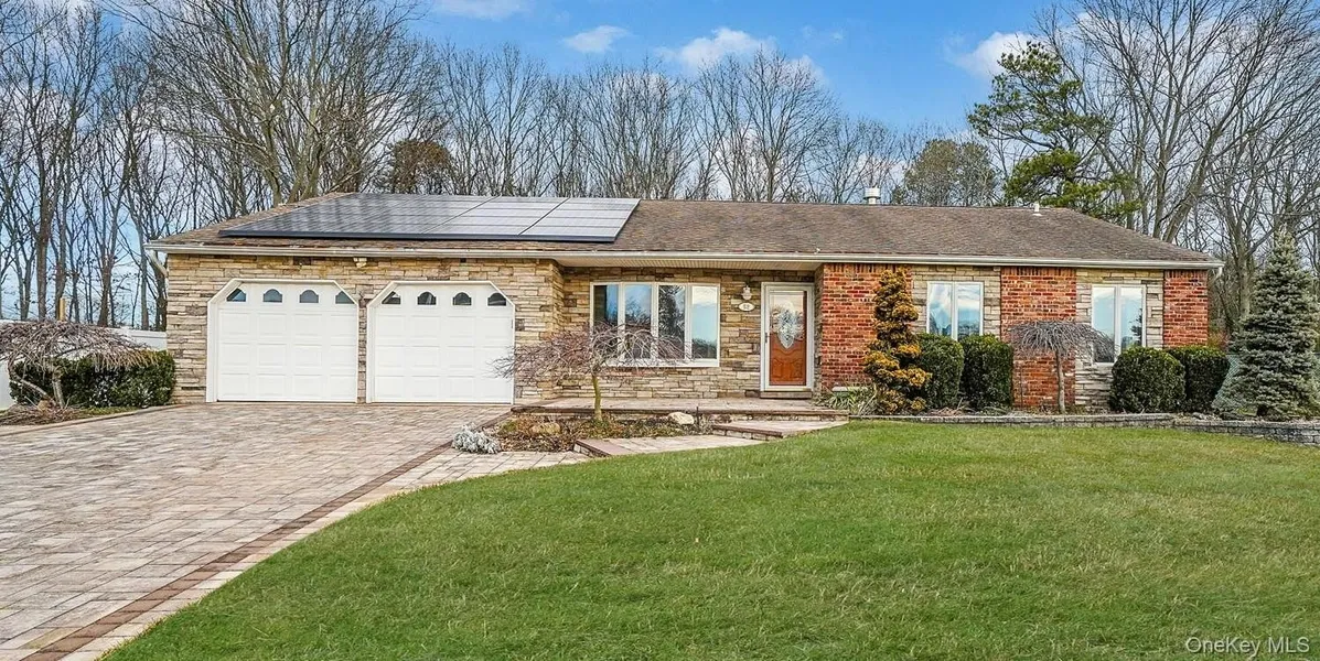 Welcome to New England Village! This standout classic ranch is set on approximately 1/3 acre in a beautiful, well-kept community with sewers and underground utilities. This 3-bedroom, 2 updated full bath home with 2 car garage and full unfinished basement shines from the moment you arrive. The exterior is a showstopper with meticulous landscaping, brick and stonework across the front, and a stone double driveway. Out back, enjoy your own private retreat featuring custom landscaping throughout the yard, stone walkway, gated white vinyl fencing, a storage shed, and an inviting deck with stone pillars-perfect for entertaining, relaxing, and everything in between. The yard also backs up to the greenbelt (protected land) with its own gated access for exploring and adventure. Inside, this home offers a bright, easy flow with an open-concept layout connecting the eat-in kitchen, dining area, and family room, plus a formal living room for more traditional space. The kitchen is finished with granite countertops and custom cabinetry, and the cozy brick fireplace adds warmth and charm. The primary bedroom suite includes an updated private bath. Additional highlights include central air conditioning, whole-house water filtration system, fully paid Tesla solar panels (approx. $14 electric bill), two-car garage with garage door openers, a full unfinished basement with spacious storage, a new oil tank also in the basement and a refurbished oil burner. New England Village is located near the Holbrook Country Club and a delightful neighborhood plaza, which includes popular community dining options. All modes of transportation are conveniently located nearby including LIRR, MacArthur Airport and The Long Island Expressway This home is move-in ready and waiting for its new owner.