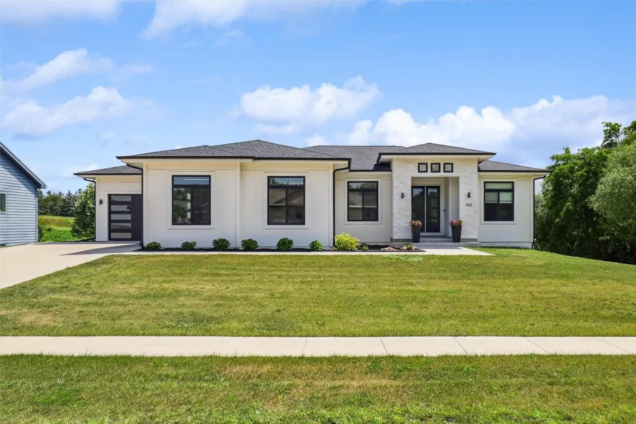 Drive up & be impressed! Stunning contemporary black & white exterior & double door entry welcome you into the foyer of this custom home built in 2020. Open floor plan & incredible views will catch your attention immediately. Spacious living room w/ fireplace opens to the kitchen, complete w/ quartz counter, stainless appliances, farm sink and adjacent walk-in pantry. Soaring ceilings throughout, featuring 3 main level bedrooms + home office (could be used as a 4th BR). Primary BR includes ensuite w/ soaking tub, walk in shower, double sinks & spa like finishes. Main level powder room & laundry (included). 3 car garage (electric vehicle outlet). Amazing covered deck w/ vinyl railing & maintainance free decking. Fully finished LL includes 2 additional BR, living room w/ compete wet bar, full bath + amazing home gym (all equipment included!) Tons of storage too + 2nd laundry. Walkout to the large 0.61-acre in-town lot, full of trees & beautiful views. Drive under 4th garage stall adds amazing storage space! So much to take in here, come have a look!