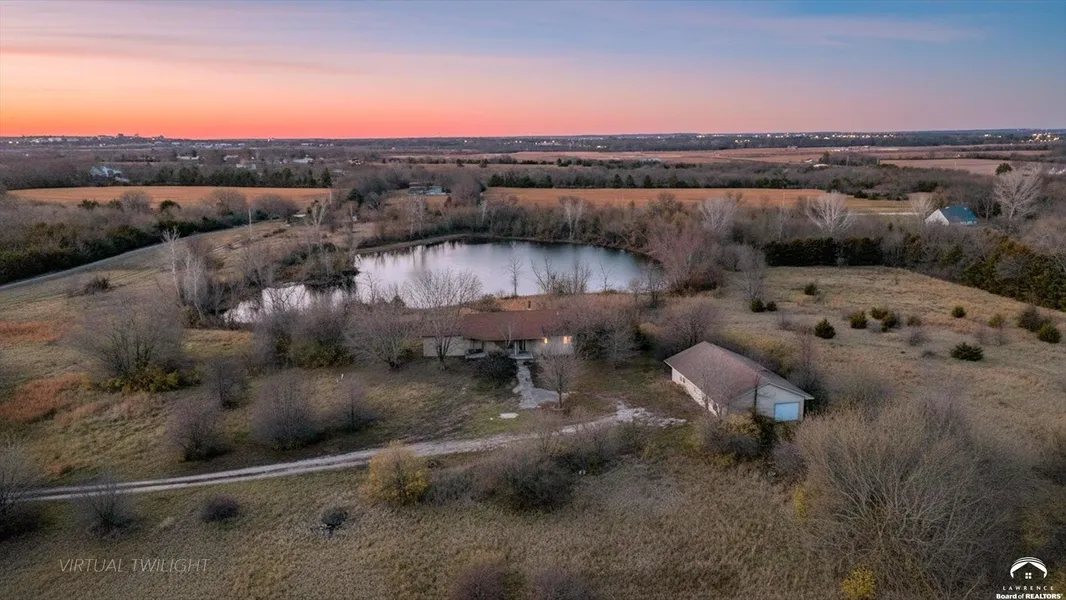 Escape to private, picturesque, and close-in country living with endless possibilities. Tucked away on a beautiful 24 acre setting on paved roads just outside the city limits of Lawrence, KS, this unique property offers a mix of mature woodlands, open pastures, a large pond and plentiful wildlife. At the center of this gorgeous land is a charming stucco, 2 bedroom, 2.5 bath, true ranch home offering 2146 sq. ft of main floor living area, an open floor plan with a large open great room with wood burning fireplace, an open kitchen with stained cabinets, an island with breakfast bar, a pantry, all appliances and a dining room with large radius picture window overlooking the gorgeous views of the pond. Rounding out the main level is a master suite with vaulted ceiling, large walk-in closet with built-ins, a master bath with stacked washer/dryer, jetted tub, walk-in shower, and water closet; an additional guest bedroom, a full bath with tiled shower/tub, and a half bath off the kitchen. The full walk-out basement was originally finished with an additional 1100 sq. ft. of living area including a recreation room, family room, 3rd bedroom, full bath and ample storage areas, but due to a water leak with subsequent mold, the basement has been remediated with floor and wall coverings removed down to the studs, so it's ready for your personal decorative touches. Don't forget the matching stucco outbuilding/workshop which offers a kitchenette, an office, a full bathroom, a mini-split HVAC and 4 overhead garage doors for all your cars, equipment and workshop needs. Whether you're envisioning a hobby farm, renovating the existing home, building your dream home, a quiet weekend retreat or a place to enjoy hunting, fishing, ATV's, riding horses and exploring nature, this property awaits your decorative vision to create a lifestyle worth dreaming about Don't miss this opportunity to Bid Your Price! Bidding ends: December 30 at 1:00 pm.