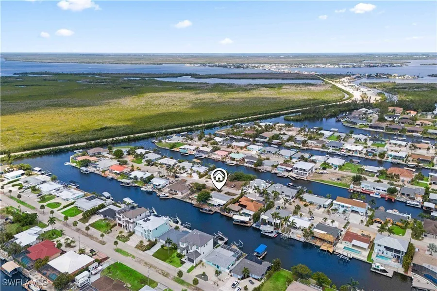 Welcome to the largest double lot in Matlacha-an incredibly rare opportunity to live on the water with wide-open views that stretch for miles. This expansive property offers unmatched space and potential in one of Florida's most colorful and charming coastal communities. Multiple outdoor lanais and covered living areas provide plenty of room for entertaining or relaxing in the island breeze. Enjoy the pool, with ample room left to create the ultimate tropical retreat. A huge private dock extends into the water and includes a 63-foot boat dock with a 12,000 lb. capacity-perfect for serious boaters looking for quick access to the open water. The home itself has a spacious layout and good bones but would benefit from some updating. Still, it's the lot that truly sets this property apart-double the size of most in Matlacha, with room to grow, incredible views, and endless waterfront possibilities. Don't miss your chance to own this one-of-a-kind slice of paradise