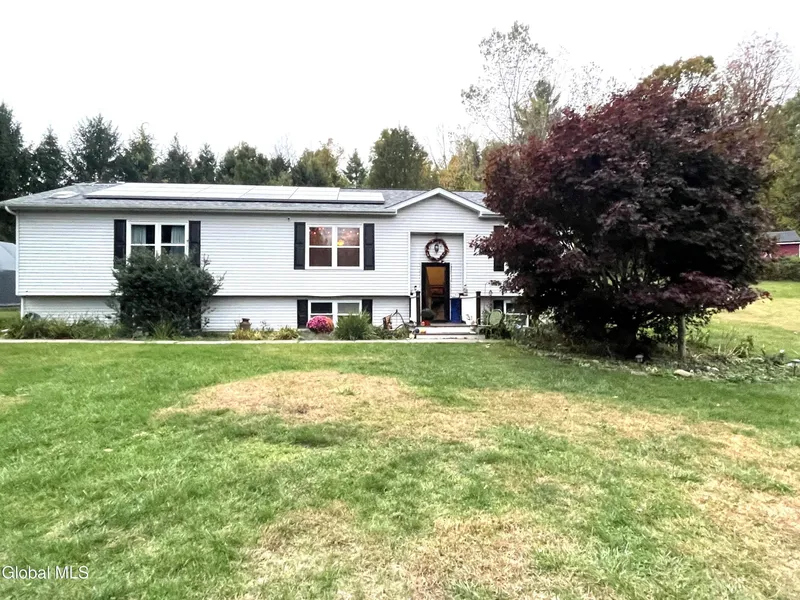 Come home to this three bedroom, two bath house with so many updates! Open LR/DR area, vaulted ceilings thruout, beautifully remodeled kitchen (2023), featuring Merillat cabinets with an abundance of storage, Cambria quartz countertops, and a stunning black walnut coffee bar area, skylight and eat in area w/slider to deck. New main bath (2025) w/skylight. Generous size primary w/full bath and skylight. Lifeproof vinyl plank flooring in kitchen, LR/DR, and hall. Basement has two finished rooms that can be used for an office, workout room, craft room... use your imagination. Also features laundry area w/slop sink and plenty of storage, a cedar closet, and a large unfinished area just waiting for your touch. Updates: new roof 2021, all upper level windows replaced 2017, wood furnace 2024, propane boiler 2015, solar panels 2015, water pressure tank 2022, new main line plumbing and leach field 2020. Large 1.55 acre lot. This house is just waiting for you to call it home!