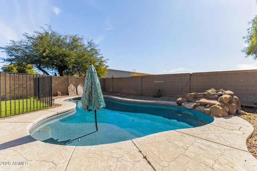 Fantastic opportunity to own this attractive 4-bedroom home in Apache Manor with owned solar! Discover an inviting living room with high ceilings, a soothing palette, blinds, and soft carpeting for added comfort. The eat-in kitchen features ample wood cabinetry, recessed lighting, stainless steel appliances, a handy pantry, and a peninsula with a breakfast bar for casual dining. The cozy primary bedroom includes an ensuite with double sinks and a walk-in closet for keeping an organized wardrobe. The home also features a rare, air-conditioned garage- ideal for comfort, storage, or a temperature-controlled workspace. Spend enchanting evenings in the lovely backyard, which offers a covered patio, pristine artificial turf, and a fenced pool for refreshing dips on hot summer days. Conveniently located close to restaurants and shopping options. Don't miss out on this incredible gem!