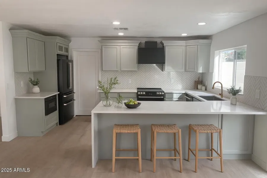 Re-imagined architecture and refined modern touches create a timeless, elevated vibe. Welcome to this gorgeously updated 3-bedroom, 2-bath residence with a stunning, light-filled open-concept design. The kitchen declares a statement, featuring a sophisticated palette, designer herringbone backsplash, solid-surface waterfall countertops, GE Cafe appliances, soft-close custom cabinetry, a walk-in pantry, and a generous breakfast bar. Wood-style plank flooring flows seamlessly throughout. Step outside to a private, resort-style backyard with an extended covered patio, crystal-blue pool, new turf, fire pit, and ceiling fans. Location is everything, with easy access to dining, shopping, freeways, and the airport-set within one of Mesa's most sought-after master-planned golf communities.