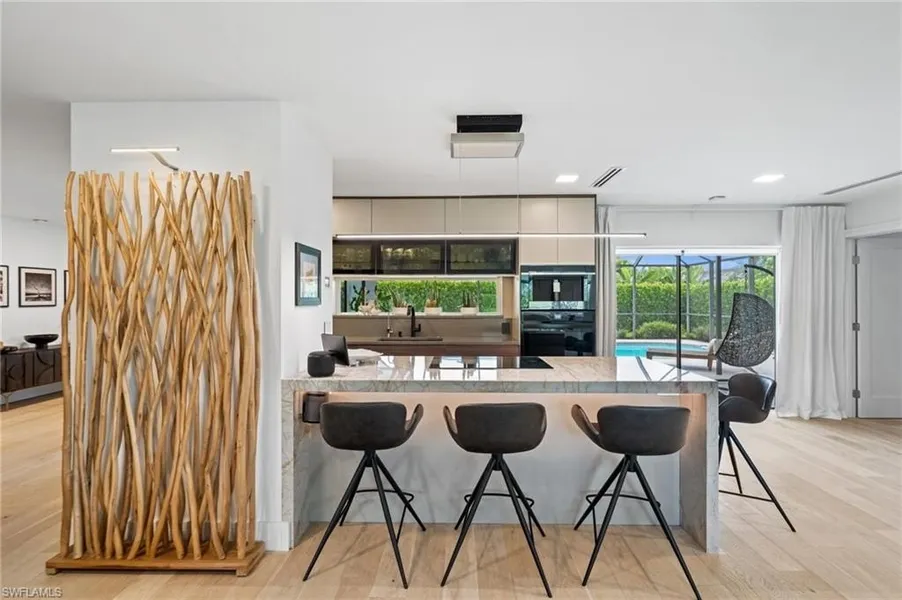 COMPLETELY REMODELED 2021. RESIDENCE COMES TASTEFULLY FURNISHED WITH LUXURIOUS , HIGH-END FURNITURE, CREATING AN ELEGANT AND MOVE-IN READY LIVING SPACE. THIS STUNNING 3-bedroom home offers EXEPTIONAL QUALITY and one-of-a-kind contemporary design. Every detail has been thoughtfully curated, from the open-concept floor plan to the imported natural stone accents from Brazil. The kitchen features a spacious island, a rare backsplash window that creates beautiful light effects, a bar area with dramatic backlit stone, and premium appliances including a smart Whirlpool oven, built-in Fisher & Paykel coffee machine, Bosch dishwasher, and smart Samsung washer/dryer. The luxurious primary suite boasts an open California-style lighted closet concept, while the home's smart features enhance comfort and convenience throughout. Step outside to a large swimming pool and expansive outdoor living area, fully enclosed with lush privacy landscaping. LOCATED just 3 miles from 5th Avenue South, this home combines style, location, and LOW HOA fees-perfect for those seeking something truly unique and move-in ready. ROOF WITH DOUBLE INSULATION- 2021,WINDOWS-2022 WITH ASTRO GUARD HURRACAINE PROTECTION-HVAC-2021, ALL ELECTRIC, PUMBING AND DRYWALL 2021, POOL HEATER AND POMP 2023. ALL WORK PERMITED AND INSPECTED. A true Naples gem that must be seen to be appreciated!