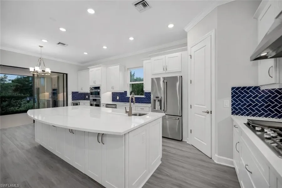 Covered screened lanai, upgraded gourmet kitchen, very large homesite, Open floor plan, Privacy wall, Spectacular sunset views, No Flood Insurance required, Pool ready with pre-plumbing for outdoor kitchen and pool. This Brand-New Lazio Home is an Open Floor Plan with High 10 Ft Ceilings, 8 Ft Doors, 3 Bedroom 3 baths, Den/Study. Situated perfectly on a Very Large Homesite at the end of Cul-de-sac lot featuring an extra-long driveway and the highly sought-after Lazio floor plan. The upgraded gourmet kitchen impresses with an oversized eat-in island with knee-wall cabinetry for added storage, a veggie prep sink, French door oven, natural gas cooking, and a breakfast nook extension. The open-concept great room showcases stacked sliders that seamlessly connect to the outdoor living area, complete with a screened covered lanai, privacy wall, and a summer kitchen ready for a custom outdoor ba...