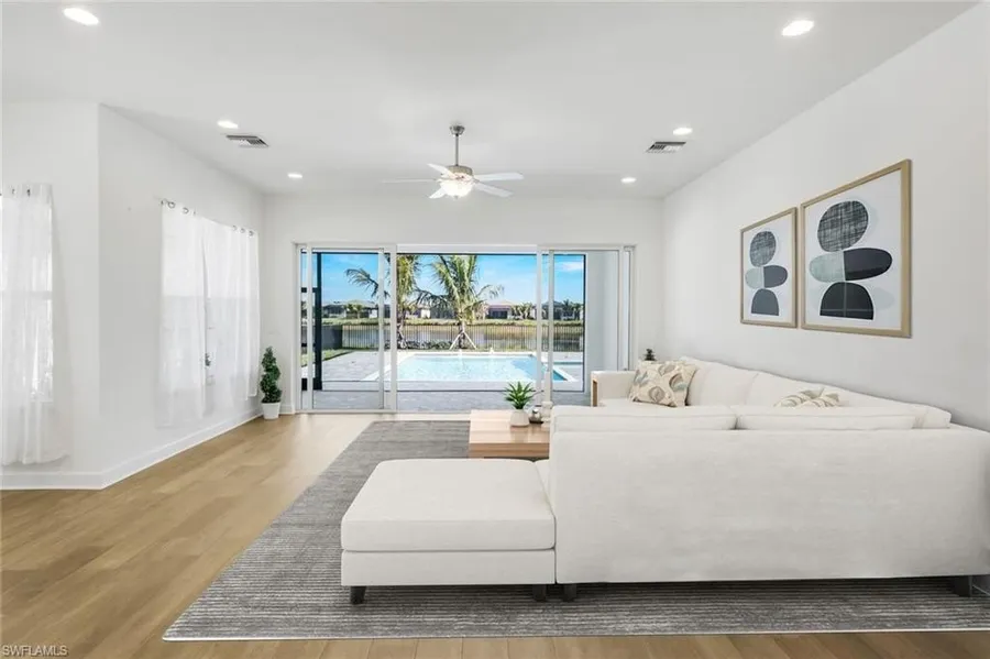 Welcome to refined, resort-style living in the prestigious 55+ community of Valencia Trails. This exceptional new construction residence blends sophisticated design with modern convenience, offering three well-appointed bedrooms, three elegant baths, and a versatile den ideal for a home office, media room, or guest retreat. The light-filled, open-concept floor plan is designed for effortless living and entertaining. At the center of the home, the chef's kitchen impresses with premium appliances, sleek quartz countertops, and a generous island perfect for casual dining or hosting friends. The spacious great room extends through expansive sliding glass doors to a covered lanai, revealing a private 30-foot lap pool with spa-an inviting space to unwind or stay active year-round. The serene primary suite serves as a true retreat, complete with a spa-inspired bathroom and expansive walk-in closets. Two additional guest suites, each with a dedicated bath, ensure comfort and privacy for visitors. Throughout the home, #1 grade hardwood flooring, striking Art Deco-inspired lighting, and an epoxy-finished garage elevate both style and function. A robust 300-amp electrical system supports up to three electric vehicles, catering to today's modern lifestyle. Offered unfurnished and ready for your personal touch, this home is your opportunity to create a space that reflects your vision. As a Valencia Trails resident, enjoy world-class amenities including a grand clubhouse, resort and lap pools, pickleball and tennis courts, a cutting-edge fitness center, scenic walking trails, and a vibrant calendar of social events. Discover exceptional Naples living where luxury, comfort, and community converge.