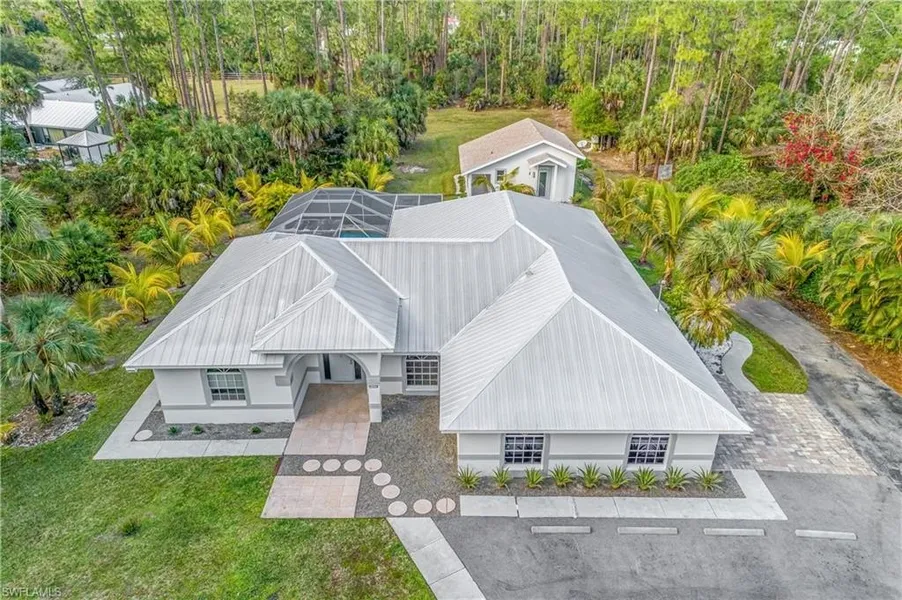 Prime North Naples Acreage Opportunity in Sought-After Logan Woods: Discover this exceptional 2.27-acre property in the peaceful, highly desirable Logan Woods neighborhood of North Naples-a rare gem offering privacy, versatility, and endless potential in one of Southwest Florida's most coveted locations. The primary home boasts around 2,410 square feet of comfortable living space, featuring 4 bedrooms, 3 bathrooms, a spacious family room, plus formal living and dining areas. The open, flowing layout is perfect for everyday living and effortless entertaining, with seamless access to the outdoors and a refreshing sparkling pool visible from multiple rooms. A sturdy metal roof ensures durability and low maintenance. Outside awaits your personal Florida paradise: a screened pool area enveloped in mature, lush landscaping, ideal for unwinding, hosting gatherings, or simply soaking in the serene, tropical vibe that defines Logan Woods living. Complementing the main residence is a versatile 560-square-foot guest house/studio/efficiency (currently configured as a 1-bedroom unit with an open kitchen-living area, full bath, and private lanai). This flexible space generates strong income potential-up to $1,600/month-making it perfect for short-term rentals, in-law accommodations, a home office, or extended family. With no HOA restrictions and abundant land, this acreage property is primed for your vision: add horses with room for pasture and stables, plant a thriving orchard, install a pickleball or tennis court, or construct an additional outbuilding to support a home-based business or workshop. Embrace the true Florida lifestyle-outdoor living, space to roam, and the freedom to customize-while being just a short drive from pristine Gulf of Mexico beaches, upscale shopping, fine dining, top-rated schools, and all the amenities that make Naples legendary. Whether you're envisioning a multi-generational retreat, a smart investment with rental income, an equestrian-friendly estate, or a blend of all three, this North Naples acreage home delivers unmatched flexibility and location. Don't miss this chance to own a piece of paradise in Logan Woods!