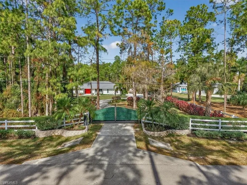 North Naples 2.5 acres with room to build additional house or guest house, barn, workshop or sports courts. This 3 bedroom plus large den lives bright and spacious. 2 beautiful updated bathrooms. Inviting living room and large dining room. 2 car garage. Open kitchen with lots of storage. Storm protection is impact glass and electric roll down shutters. Property is furnished with interior and exterior furniture. Tiled throughout. Great for entertaining with the 16' x 30' salt- water heated pool, In-ground 7' x 7' spa. Approx. 1,800' paver deck with pergola. Fenced with electric gate. Lush landscaping provides great privacy. Irrigation system. Completely remodeled from 2013 onwards. Metal roof. Many, many recent upgrades. Quiet on a cul-de-sac street. One traffic light to shopping, restaurants and services and an easy drive to Naples sandy beaches.