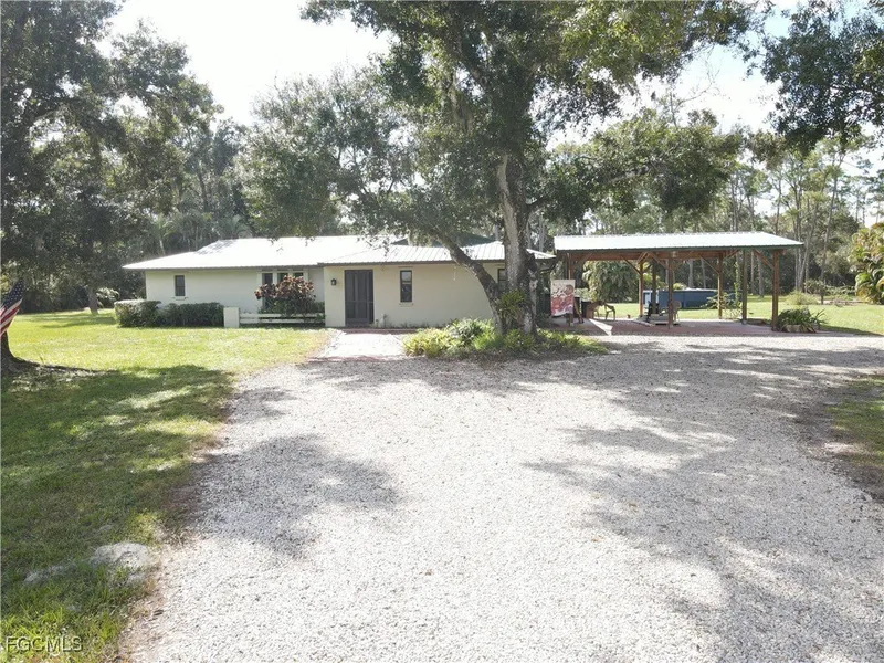Check out this beautiful 4.84-acre property in North Fort Myers, located on a paved, county-maintained road. The yard is stunning, featuring trees, a gravel circle drive, plenty of parking, a large 27x40 workshop in the back, and a creek at the far end of the property. There's ample room for toys or horses, along with a spacious carport. This home is ready for a new owner to make it their own and enjoy the peaceful country lifestyle. New LIFEproof vinyl floors have been installed in the bedrooms, living/dining rooms, and closets. The original garage has been converted into a bonus room, bedroom, game room, or office with a closet. The laundry room, now under air, includes a large pantry/walk-in closet area. The property also offers a screened lanai, an outdoor patio area, and a versatile carport for parking or hosting events. Located in a fantastic area of NFM, close to the Lee County Posse, this home is just a short walk from the rodeo. A must-see!