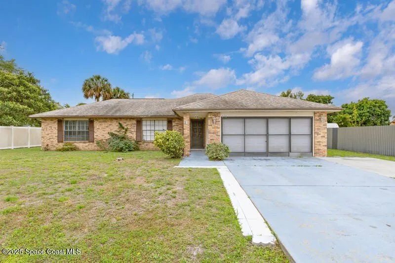 Charming three-bedroom, two-bath residence nestled in the heart of Palm Bay, This well maintained property boasts a perfect blend of comfort, style, and functionality, making it an ideal haven for families, professionals, and anyone seeking a relaxing retreat. The interior boasts a spacious open floor plan that seamlessly integrates the living, dining, and kitchen areas. The updated kitchen has newer appliances and generous breakfast bar space. The large Primary Bedroom has plenty of closet space and the Primary bathroom offers a double vanity. The private backyard has an oversized storage building. In addition there is a private well for irrigation. The home is close to shopping, entertainment, and churches. VA ASSUMABLE. This is a must see!