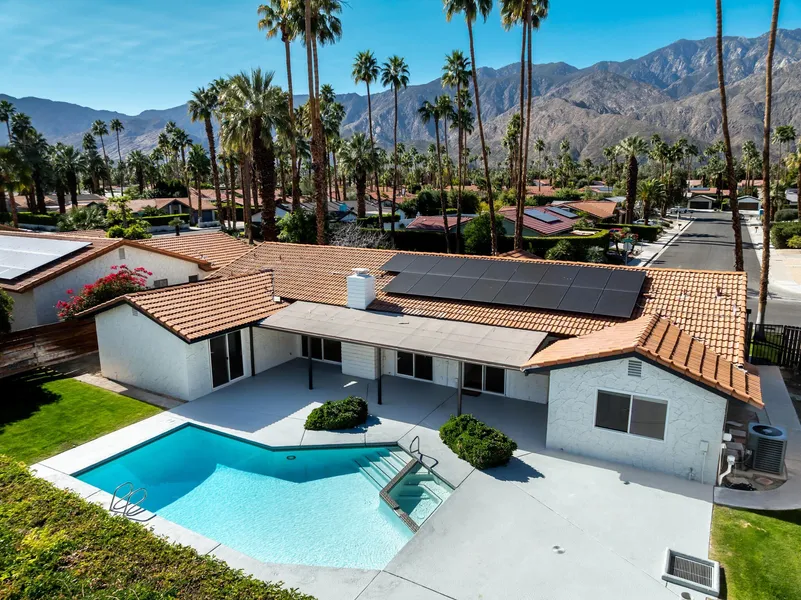 Beverly Drive Delight - South Palm Springs! Two primary suites, guest bedroom, additional office/den, and 1 Full Bath, and 2 three quarter baths. Updated kitchen, open living/dining with high ceilings and gas fireplace. Travertine Tile floors, carpeted bedrooms, resort-style pool & spa, covered patio, and panoramic mountain views. New roof 2023 Leased solar panels with battery pack 2024. Within Los Compadres Estates, the Association features HOA-maintained tennis and striped pickle-ball courts set within a gated common area, along with a landscaped grassy area nearby. Access, use, and maintenance are governed by HOA rules and fees. Set within the established Los Compadres Estates, this location offers a classic Palm Springs charm backdrop with mountain views and no visible overhead power lines. Conveniently positioned near Smoke Tree Commons, the CV Link bike path, and downtown Palm Spri...