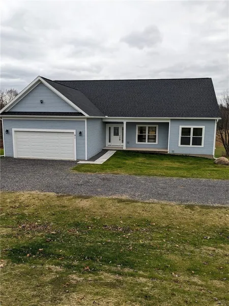 New build, move in ready, never been lived in! Impressive semi-custom open floor plan ranch on a one acre country lot. Bright open spaces with tasteful finishes throughout. Large eat in kitchen with adjacent cathedral ceiling dining room with skylights. Black stainless steel appliances. Lovely granite countertops with an eat-at island. Maple cabinets. Kitchen opens to a large living room, large windows and sliding glass door views to the back yard and woods behind. 9 foot high ceilings! Premium LVP flooring in the main living area, ceramic tile in the baths, carpet in the bedrooms. Multiple ceiling fans throughout. Gorgeous main bath with soaking tub. 13 course huge open basement with double door walkout ready for infinite possibilities. Convenient to Canandaigua or Route 31 to the city. Many nearby amenities and shopping.