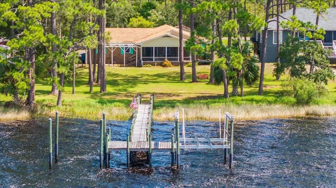 Welcome home to this bayfront property, situated on over a half acre lot, with 90 feet of deep waterfront, with a dock and boat lift already in place. Hard to find 2 bedroom ground level home, with no elevator needed, situated on a high and dry bayfront lot. In addition to a well built and very solid home, this treasure features exactly what you are looking for with a screen porch on the waterside for enjoying the views and breezes, looking out over a well-constructed dock and 8,000 lb boat lift, and nothing beyond it but open water. Peaceful protected setting, everything across the bay is state preserve land, and across the street is national wildlife refuge. Thats hard to find in a property that still offers paved road frontage, public sewer and water, and high-speed internet. After a day of fishing or exploring simply lift your boat out of the water, stash the rods and gear in the perfect coastal workshop on site, and relax with a drink on the porch as the afternoon sea breeze rolls in. From there its a short drive to some of the best seafood restaurants in the country, or chill and relax at home with plenty of space to entertain and enjoy company right at home. If you are looking for a low maintenance coastal getaway that offers everything you need all in one location this might be the one for you.