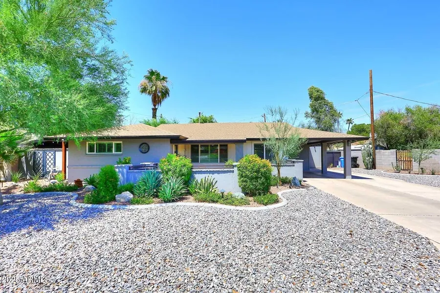 Beautifully updated mid-century ranch home in one of Central Phoenix's most sought-after neighborhoods. Remodeled chef's kitchen w/ stainless steel appliances, Bosch dishwasher, new cabinets, quartz counters, & marble backsplash. The polished, acid-stained concrete floors flow throughout. Stylish upgrades include a sleek electric fireplace, new doors, designer lighting, premium shutters, & elegant baseboards. Multiple resort-worthy professionally designed outdoor spaces with new pavers, plank patio ceilings, bamboo accents, updated electrical, sprinkler system, lush sod, & landscape edging. Large primary suite w/ French doors to a private patio, spacious closet, and en-suite bath w/ Kohler vessel sinks, custom tile shower, and WaterSense toilets. Fresh exterior paint. Newer AC.