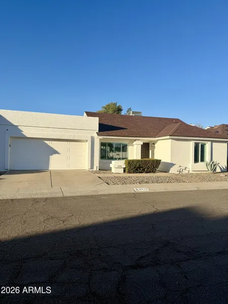 Beautifully upgraded single-level home with modern finishes, vaulted ceilings, and a bright open layout. Fresh exterior paint adds crisp curb appeal, complemented by low-maintenance desert landscaping and an attached 2-car garage. Inside, stunning new flooring flows throughout, creating a seamless contemporary feel. Spacious living areas feature recessed lighting and soaring ceilings. The upgraded kitchen offers granite countertops, stainless steel appliances, breakfast bar seating, and ample cabinetry. The primary suite has new flooring and direct patio access. Renovated bath includes a marble-style vanity, updated fixtures, and tiled walk-in shower. Additional highlights: new windows, AC (01/21/26), plantation shutters, split AC in office, updated lighting. Turnkey and ready to move in.