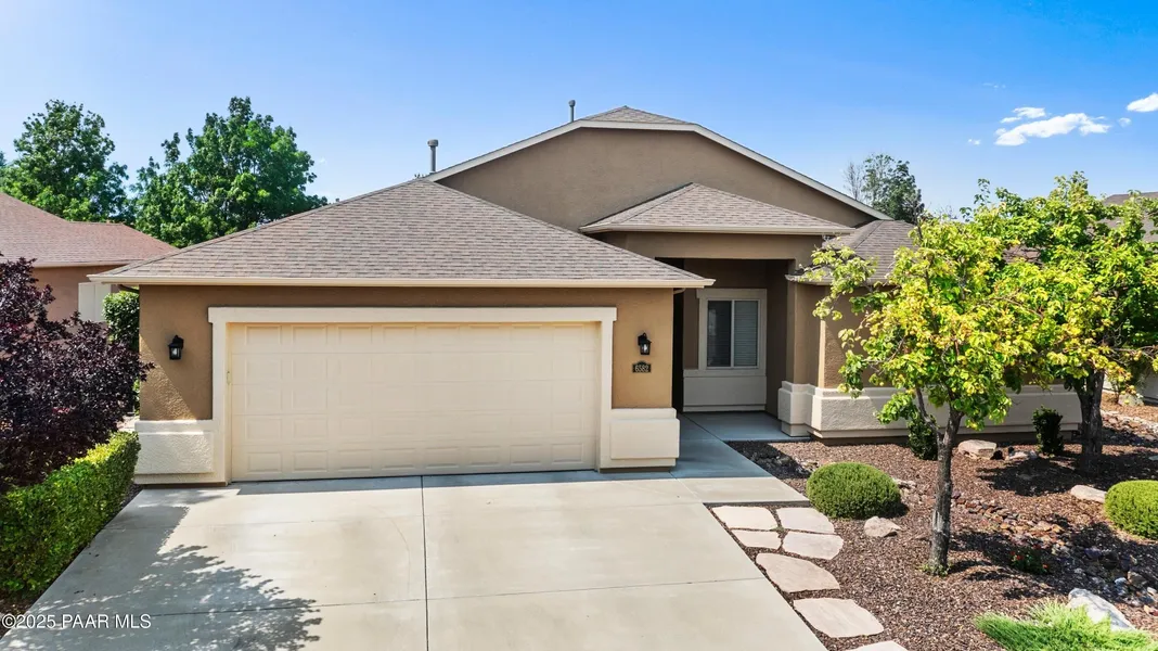 BRAND NEW ROOF - This upgraded & updated Granville home is tucked away on an interior street and with a north/south exposure lot, this lovingly maintained, 2,037 sq. ft. 4 bedroom/2 bath home is turnkey and ready for its next chapter! The enduringly popular split floorplan is spacious, with ample rooms from top to bottom. Lovely curb appeal will greet your visitors, starring neatly manicured, mature landscaping and a charming security door at the covered entry. The large great room leads to a bright, inviting dining area with bay windows for added views and excellent light. Kitchen is well appointed, with a pantry and extensive cabinetry (42'' uppers) for good storage, eat-at island, new stainless-steel sink and RO system, classic granite countertops, gas cooktop with outside-venting range hood, wall oven, and a French door refrigerator. Unwind at the end of the day in the oversized primary suite, with his-and-hers walk-in closets, dual sink raised vanity, private commode closet, garden tub, and a large separate shower in the very shareable ensuite bathroom. Walk-in closets are also available in two of the three secondary bedrooms. Household chores are made a little lighter with a utility sink and cabinetry in the laundry room, not to mention an LG front loading washer & dryer set. Home has been repainted both inside and out, with a stylish neutral for the 2-tone interior. Window treatments include blinds, shutters, and shades, while beautiful, upgraded tile and hardy vinyl plank flooring have you covered underfoot. Built-in cabinetry helps keep you organized in the 2-car garage, where an insulated overhead door provides energy efficiency and enhanced comfort. Enjoy solo R&R or let the good times roll with friends on the covered patio and the added deck with pergola and party-ready bar. Your refreshing, fully fenced backyard is highlighted by a lush hedge for privacy, center lawn with sidewalk surround, and raised garden beds to please the green thumb in your household. Take advantage of Granville's huge list of amenities, included with a very reasonable HOA fee: three clubhouses with community activities, pools, fitness rooms, playgrounds, basketball, pickleball and tennis courts, a dog park and more! Just minutes from home are Prescott Valley's ever-expanding shopping options, restaurants, medical facilities, entertainment, and all you could need or want from day to day.