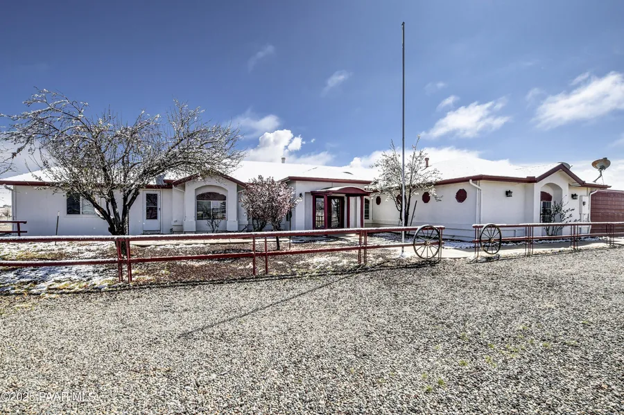 HUGE PRICE REDUCTION! Discover the perfect blend of comfort & functionality in this open concept 3,380 sq. ft. home located in Prescott Valley. Set on an expansive 9.45 acres, this property offers ample space for both relaxation & recreation. This beautifully designed home features 4 bedrooms, and 3 baths, providing plenty of room for family and guests. Built in 2004, the residence showcases high ceilings, incl vaulted ceilings and skylights that fill the living spaces w/ natural light. The property boasts a remarkable 1,500 sq. ft. utility bldg./garage, constructed in 2008, ideal for storage, a workshop, or additional projects. There is additional 600 sq ft building ideal for extra storage, work out room, etc. The 2232 sq ft barn is spacious & ready for your 4-legged family membe