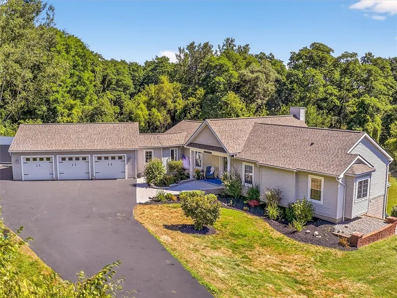 1996 Custom Built, 1st FLOOR Living at it's finest! Sitting on a Private, Beautiful, Wooded 5.15 Acres, this EXPANSIVE RANCH w/ a Full Finished Walk Out Lower Level is just minutes away from the convenience of expressways, shopping, etc. Pull up on the Freshly Sealed drive to ample parking space & 3 car garage. True NO STEP ENTRY makes this house accessible for many w/ it's variety of ADA compliant features. Inviting, Attractive entry, up the gently sloped stamped concrete graded sidewalk, into the Open LARGE Foyer. Great sightlines from foyer thru Great Room adorned w/ floor to ceiling windows overlooking the serene view. Formal Dining adjoined to Living Area. EAT In Kitchen has been updated: Oven/Range '21, Fridge '20, Newer Dishwasher, Granite Counters, Hardwoods. You will not lack for space with over 3,500+ sq ft of living space, 4 Bedrooms (w/ option for a 5th), 3 FULL & 1/2 BATH. New 1st Floor LVT flooring '21 leads into the Bedroom wing. Primary Suite features oversized Bedroom, Large Walk In Closet w/ New Sliding door & Full Bath (no-step shower) AND your own private Deck! 2 Additional Bedrooms on 1st Floor w/ Full Bath. Generous Mudroom & Powder Room ('24). Downstairs: massive Family Room w/ Gas Fireplace, Serving Area w/ Wet Bar & Chilling Fridge, 1 Full Bedroom, & 1 Full Bath. Additionally the Lower Level offers an Office Space or Additional Bedroom potential (GREAT In-Law option too!). Plenty of STORAGE (EVEN has it's own prohibition style wine closet)! Outside- Enjoy 3 Decks w/ ALL NEW decking in 2024. A Private Pond for your recreational enjoyment (new pump '24 w/ gutter run off to pond), Giant Firepit & Many Acres to explore. NEW TEAR OFF ROOF '23, MANY New Windows & Sliding Glass Door '23, Fresh Interior Paint, Patched/Sealed Drive '25. (Listing Includes as a package, additional tax parcel id: 263200--030-200 for a total of 5.15 acres). Note: Sq Footage includes WalkOut Finished Lower Level measured by appraiser & confirmed by "Matterport". Showings begin Thursday 8/21. Delayed Negotiations- offers due at 4pm Tuesday 8/26.