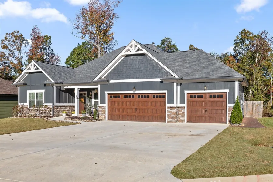 Welcome to this stunning home located in one of the area's most sought after neighborhoods, offering pickleball courts, a swimming pool and a playground for residents to enjoy. Conveniently located near the lake and marina, you'll have easy access to boating, fishing and waterfront recreation right outside your neighborhood! Nestled on a .59 acre lot backing up to woods, the home offers exceptional privacy. The sodded, fenced backyard (with three gates) includes three raised garden beds, a covered patio plumbed and ready for an outdoor kitchen, and an uncovered patio with 110 and 210 outlets- perfect for a future hot tub. There's also an 11'5x9'8 storage room on the back of the home, ideal for tools or outdoor gear. The three car garage includes built-in cabinets, a workshop area, and is wired for a mini-split HVAC unit- a great setup for hobbyists or additional workspace. The thoughtfully designed one level home with a bonus room and full bath upstairs offers flexible living space. The main level features an office, two bedrooms with a shared full bath, and a private primary suite with a tiled shower and large walk-in closet. The open concept kitchen, dining and living areas make entertaining easy, with direct access to the amazing backyard. The kitchen includes granite countertops, tile backsplash, gas cooktop, stainless steel appliances, walk-in pantry and large island. The living room boasts a cozy gas-log fireplace and beautiful flow throughout the home. The main level showcases durable LVP flooring, blending warmth and functionality in all the main living areas and the primary suite. Off the garage, you will find a mudroom that leads to a laundry room with cabinets, hanging space and a sink. A spacious bonus room, full bath and walk-in attic storage provide a great versatility for guests, a playroom or media room. Community amenities and private backyard setting combine the best of convenience and relaxation. This home truly blends functionality, comfort and outdoor living potential! Don't miss your chance to make it yours! The buyer is responsible to do their due diligence to verify that all information is correct, accurate, and for obtaining any and all restrictions for the property. The number of bedrooms listed above complies with local appraisal standards only.