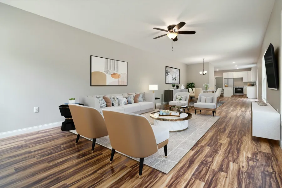 Stunning new construction in the desirable Shelby Woods neighborhood! This spacious 4-bedroom, 2.5-bath home offers room to grow with walk-in closets in every bedroom and thoughtful design throughout. The grand foyer welcomes you with a beautiful staircase leading to the luxurious primary suite-complete with tray ceiling, oversized en suite bath, walk-in closet, and private balcony overlooking a serene .56 acre lot with mature trees. Upstairs includes 2 additional bedrooms, a full bath, and a bonus storage room. The main level features a bright and open layout with a stylish kitchen offering quartz countertops, shaker cabinets, and a large walk-in pantry. You'll also find a separate dining area, living room, office space, and convenient half bath and laundry. Finished with durable Diamond Coat siding (50-year no fade warranty) and a spacious 2-car garage. Peaceful setting just minutes from Danville, Stanford, or Liberty. Don't miss your chance to tour this exceptional home!