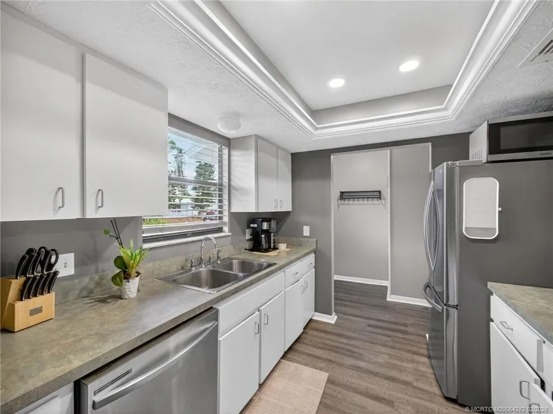 Welcome to the perfect blend of charm, comfort, and coastal convenience. This 2-bedroom, 2-bath home with a one-car garage sits on an extra-large fenced yard offering abundant space for a pool, boat, RV, or all three. The exterior has been beautifully updated with durable Hardie Plank siding, and a brand-new roof is scheduled for installation in February 2026 for added peace of mind. Step inside to a bright, open layout featuring luxury vinyl plank flooring, a cozy fireplace, and a coffered kitchen ceiling that adds architectural character. The kitchen offers stainless steel appliances, a convenient pass-through to the great room, and easy flow for everyday living or entertaining. The spacious primary bedroom includes stylish barn doors and an ensuite bath.