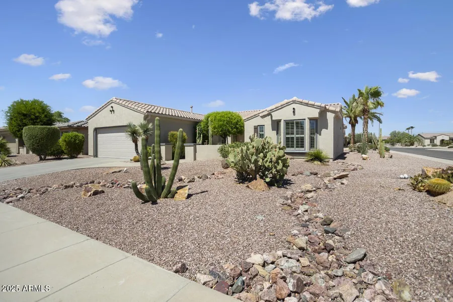LOOK AT THIS PRICE!!! Well maintained Valencia II, 1950 sq. ft., 2BD/1.75BA home on a desirable corner lot with front courtyard with water feature and great curb appeal. Many upgrades including new roof (2025), extra attic insulation, plantation shutters, Kohler toilets, heat lamp on primary bath, stainless steel appliances, and newer LG refrigerator, pull out shelves in lower cabs. NEW Water softener. Laminate wood floors in den/office, closet with custom organizers; tile in main areas. Extended garage w/cabinets & side door. Enjoy extended back patio with cool decking, sunshade, ceiling fans & BBQ. Expanded guest suite with bay window, primary suite with bay window & California Closets. Raised panel doors, ceiling fans throughout, water softener, hot water recirculating pump, and gas stub for stove