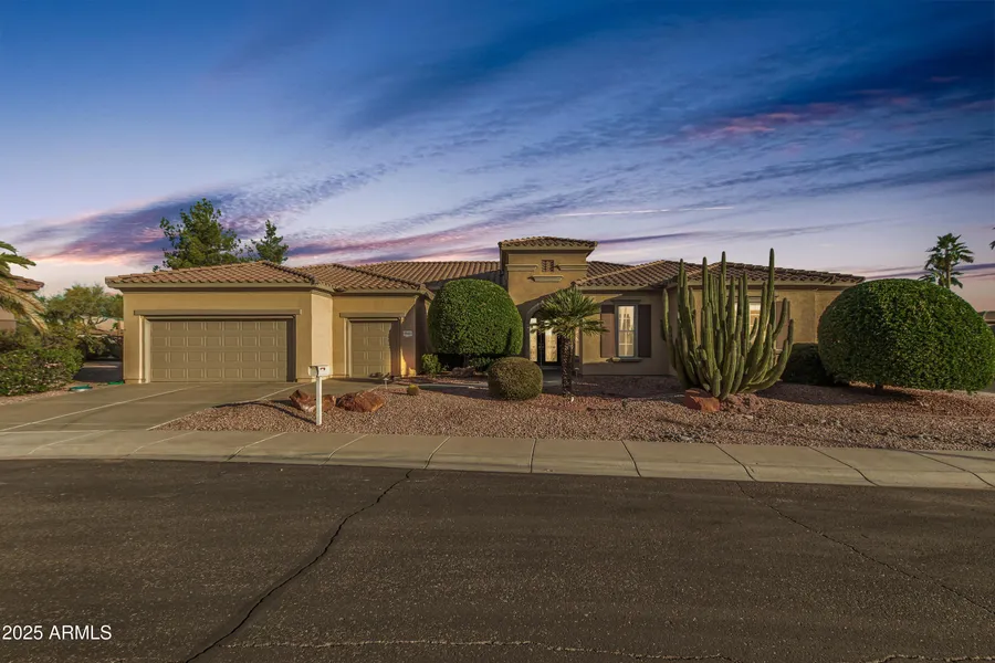 Rare Windsor model, this is the largest floor plan in the community located on a quiet cul-de-sac in the desirable Regent neighborhood of Sun City Grand. This home features a BRAND NEW ROOF completed in December 2025. This original-owner home has been meticulously maintained and features soaring 12-foot ceilings, multiple living spaces, a cozy gas fireplace and a versatile den. The spacious primary suite offers dual walk-in closets, a garden tub, and walk-in shower. Enjoy an extended covered patio, landscaped yard with water feature, and golf cart garage parking situated on a corner lot. Sun City Grand offers golf, resort-style pools, fitness centers, clubs, and an active social calendar. Homes of this size and quality rarely come available.... don't miss this opportunity. The versatile den provides additional living space, ideal for an office or lounge. Imagine enchanting evenings in th...