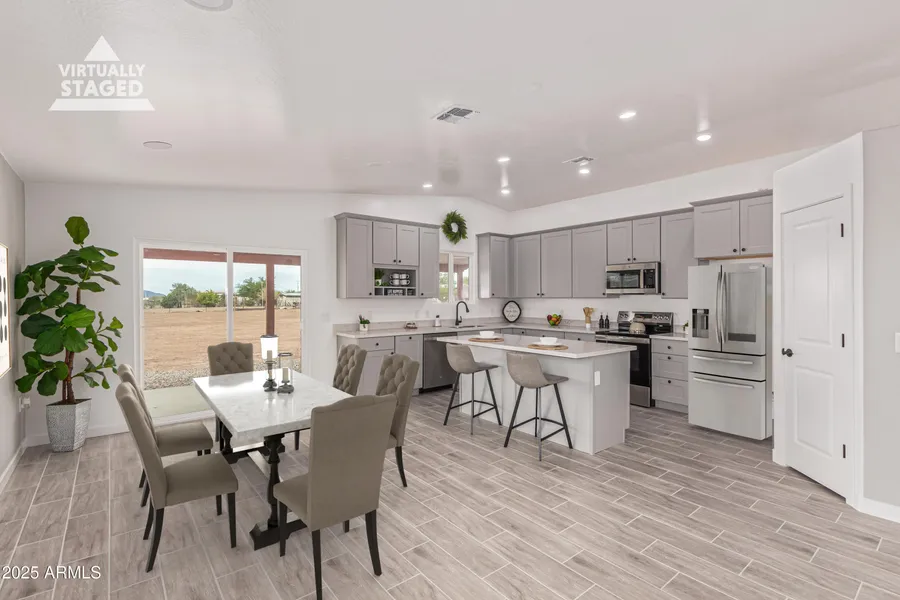 Desirable Hidden GEM! BRAND NEW 4 bed/2 bath home on 1+ acres with NO HOA! Serene private living and endless potential to create your own paradise. Enjoy 360 degrees mountain views, breathtaking sunsets, and quick access to paved roads, & freeway. Plenty of space for toys, animals! RVs, gardens, or workshops-no restrictions here, giving you freedom to design the lifestyle you truly want. Inviting front porch opens to a bright layout with wood-look tile, neutral palette, vaulted ceilings, and abundant light throughout. Stunning kitchen includes gray shaker cabinets, quartz counters, SS appliances, pantry, and island with breakfast bar. Relax in the main suite with walk-in closet and private bath. Spacious lot offers room to grow. Come 'BUY' your new ranch today!