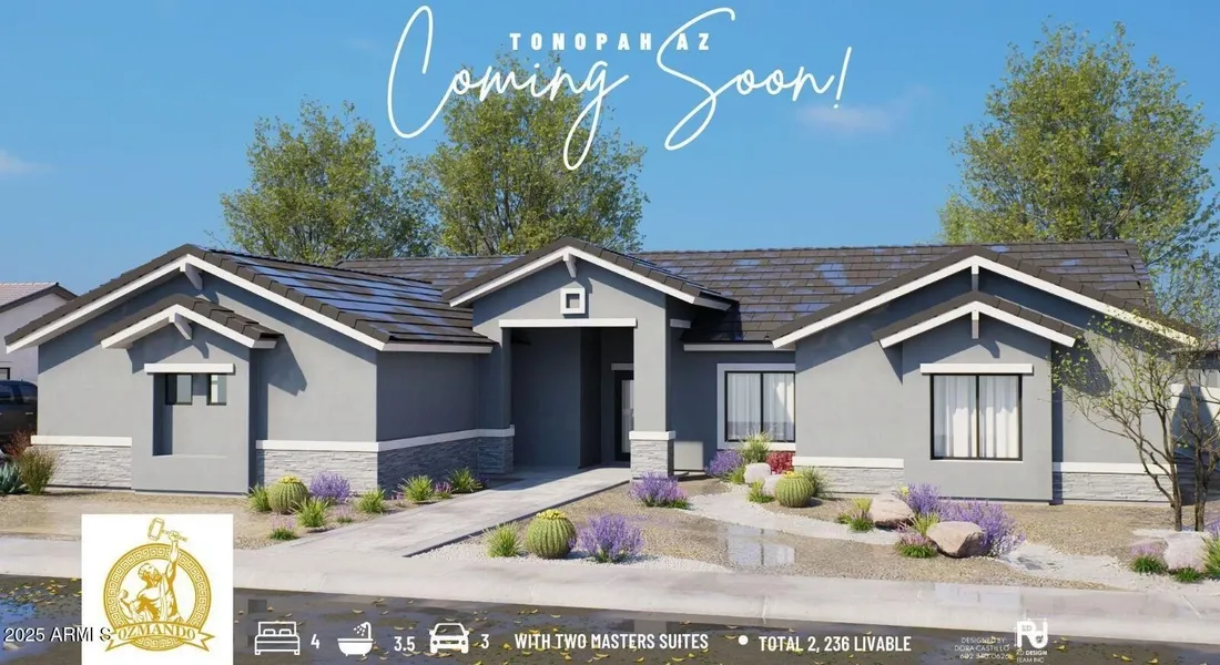 Gorgeous custom home on a 1.14-acre lot in one of Tonopah's most desirable and fastest-growing areas! This 4 bed, 3.5 bath home offers a smart split floor plan with a luxurious master suite, junior suite, and walk-in closets in all bedrooms. Enjoy an open-concept layout with high ceilings, quartz countertops, a large island, modern cabinetry, and a built-in buffet counter ideal for serving or storage. The oversized 3-car garage is perfect for toys, tools, or extra space-essential for desert living. No HOA, space for RV gate, casita, or pool. Easy main road access!