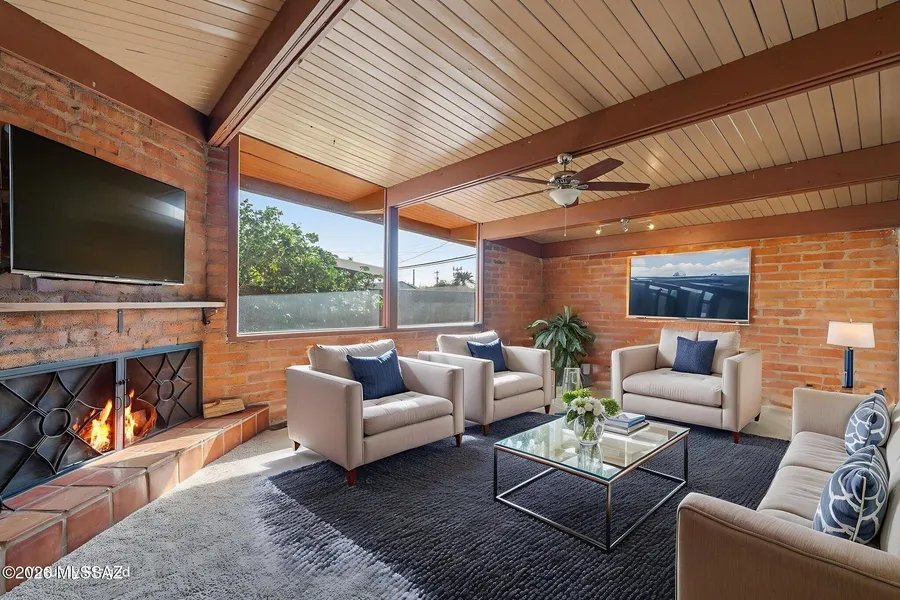 Classic 1953 mid-century ranch built in timeless burnt adobe, blending character with modern comfort. This 4-bedroom, 2-bath home features a fully remodeled kitchen with an eat-at breakfast bar, perfect for casual dining and entertaining. The inviting living space is anchored by a cozy wood-burning fireplace, while the Arizona room offers flexible space for relaxing or hosting guests year-round. Step outside to a huge pool ideal for Arizona living. No HOA adds freedom, and the 3.5-year-old HVAC provides peace of mind. A rare opportunity to own a thoughtfully updated mid-century gem with space, style, and character.