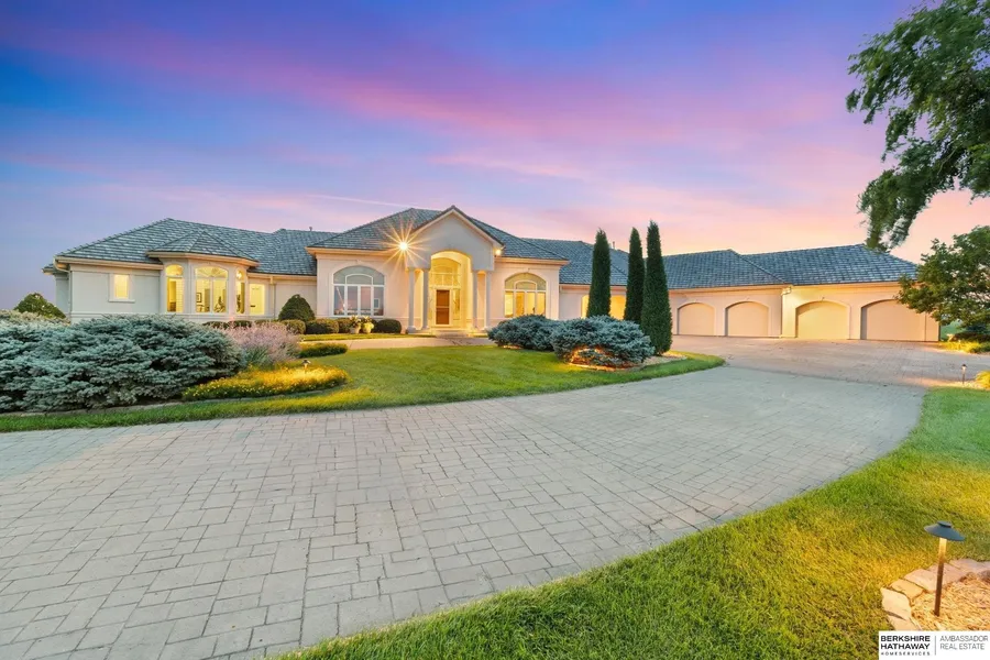Deb Cizek, M: 402-699-5223, , - One-of-a-Kind Private 10+Acre Estate offers Expansive Views! Rarely available & rich in possibility, ranch home has sweeping, panoramic views stretching for miles. With this sprawling custom home, no detail was missed. Open living spaces were designed for everyday comfort & family entertaining. You'll love the bright, light-filled great rm w/ expansive windows & working in the wood paneled office or tiled sunroom. Kitchen w/ double islands, large walk-in pantry, & open to large hearth rm. Primary BR features sitting rm, exercise rm, laundry rm, & dreamy closet w/ built ins. W/O LL has 2 BRs, wet bar, & tons of storage. Major upgrades include new slate tile roof & Pella windows & sliding doors (see property highlights). Outside is a personal oasis: sparkling pool w/ automatic cover, slide, & fountains, cozy lounge areas, pergola, mature landscaping, lighti...