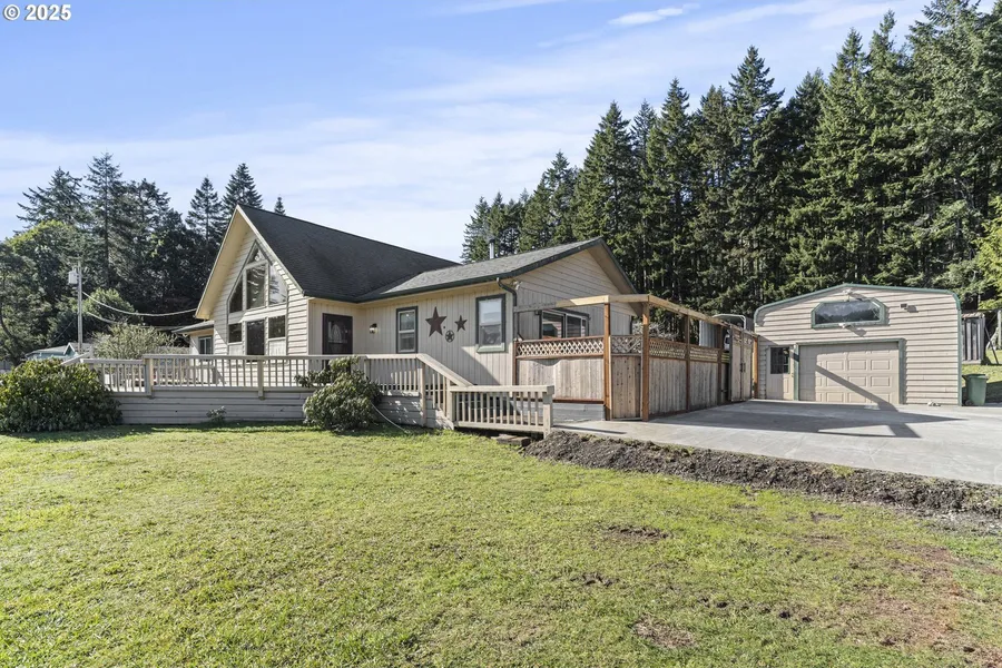Stunning Country Retreat on 1.41 Acres – Two Tax Lots! Escape to tranquility with this fantastic country home offering breathtaking distant mountain and pond views. Enjoy the outdoors from the expansive front deck or relax in the red cedar gazebo with a luxurious swim spa (16’ x 5’ deep, flow jets, fountains, and lights). The private outdoor space also features a large patio, seating areas, and room for a garden. Inside, the living room showcases vaulted wood ceilings, floor-to-ceiling windows, and hardwood floors, creating a bright and inviting space. The kitchen has formica countertops, an eat-in bar, and custom cabinetry, flowing into the adjacent dining area with a wood-burning stove and sliders to the back deck. The primary suite features private deck access, a spa-like en-suite with double sinks, and French doors leading to a cozy office/reading nook. Two additional bedrooms, a full bathroom, and a laundry room with extra storage and backyard access complete the home. A charming loft space with tongue and groove ceiling and walls is accessible via a trap door in the dining area ceiling. This property is a dream for hobbyists and outdoor enthusiasts with a 1,568 SF machine shop, large detached garage, tool shed, RV/boat carport, and a 4-bay parking shed. Additional amenities include a heat pump for heating and cooling, and security cameras. Just minutes from Powers County Park, where you can enjoy fishing, kayaking, and canoeing on the pond, plus picnic areas for the perfect outdoor getaway.