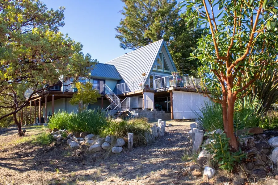 COUNTRY SETTING CITY CLOSE! This well maintained Gem is sitting on over 5 beautiful acres with stunning views from the large wrap around porch. It's a dream A-FRAME home featuring 3 bedrooms, 2 baths plus 367 sqft of additional finished basement space (above ground) with exterior access. The open concept center island kitchen offers newer cabinetry, ample storage, a pantry and plantation blinds. Main level: living room with built in cabinets to maximize space, new certified wood stove, primary bedroom, bathroom & laundry room. Two bedrooms up the spiral staircase plus walk in attic (bonus room) and second bathroom. Freshly painted exterior in 2024, new hybrid water heater installed in 2024, workshop area in garage, chicken coop, RV parking, a variety of trees & a seasonal creek + endless possibilities. You've got to tour this one of a kind, property in person.